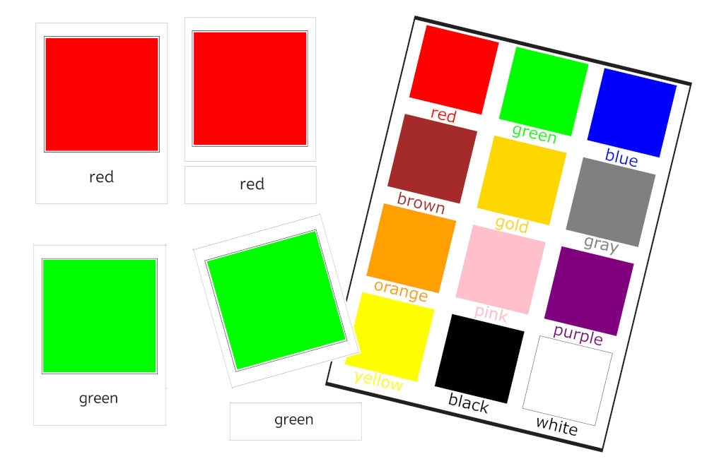 This PDF set includes 3-part cards for 12 colours: red, green, blue, brown, gold, gray, orange, pink, purple, yellow, black, white.
