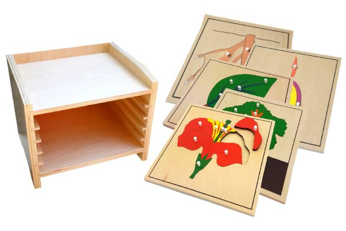 Wooden cabinet with 5 botany puzzles: flower, tree, leaf, seed, and root.