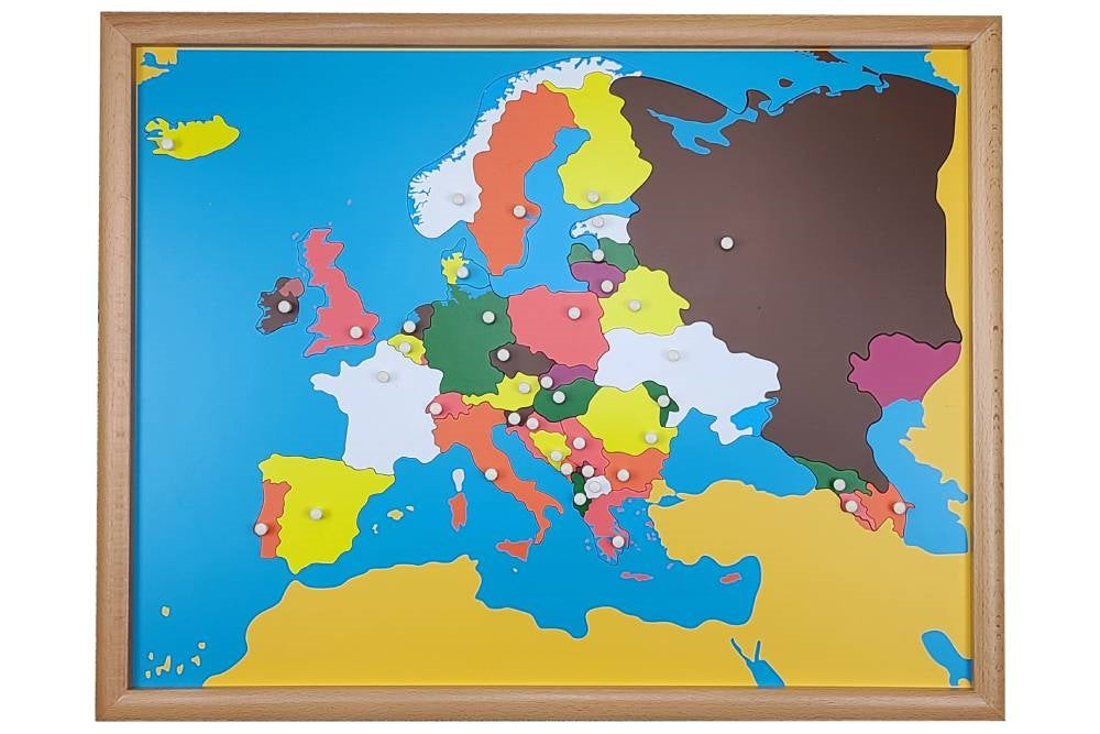 A set of eight puzzle maps with a matching hardwood cabinet. Maps included are the six continents, world map, and the USA. Cabinet has a small shelf for holding control maps.