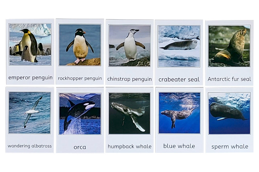 This set includes printed 3-part cards for 10 Antarctic animals.