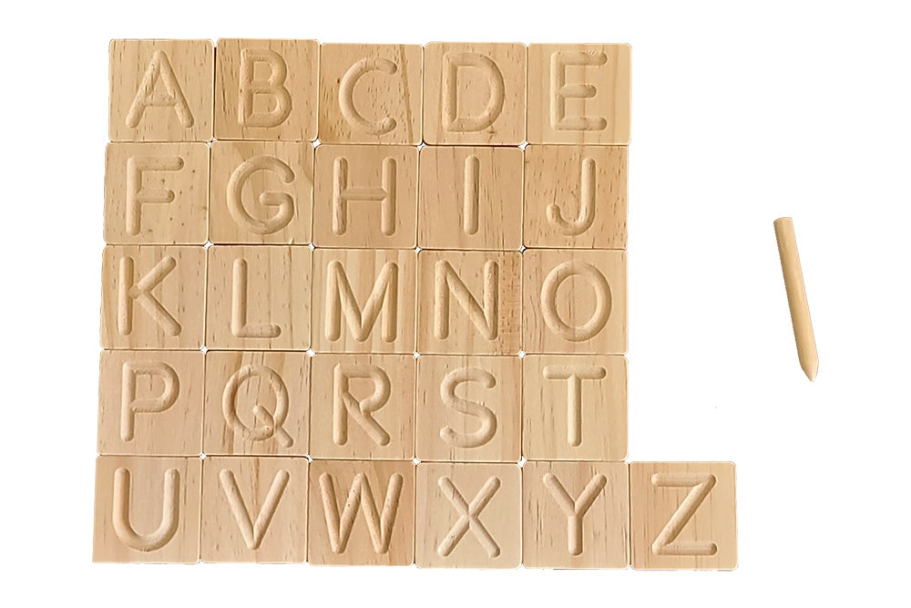 This set contains 26 wooden letter tracing boards in capital case, a wooden pen, and a wooden tray.