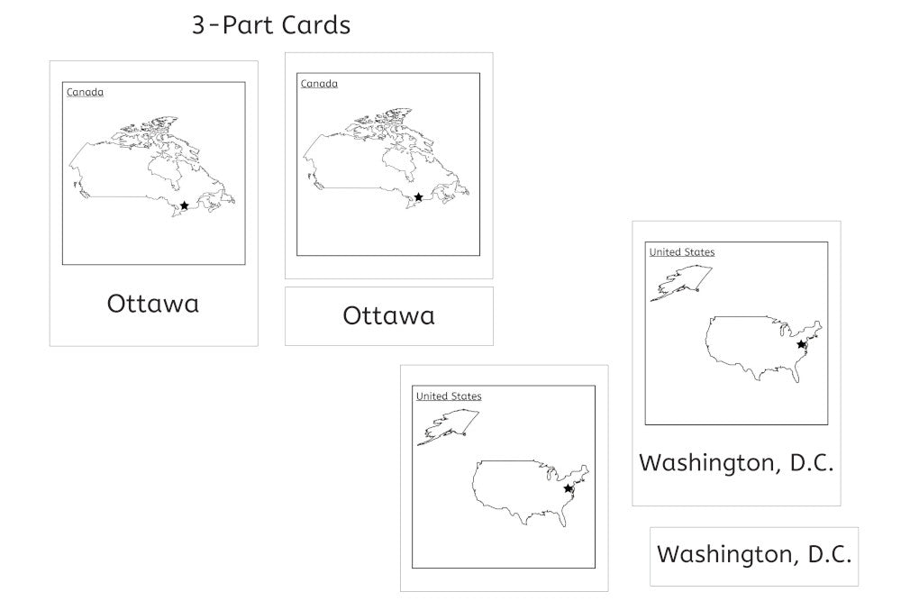 This downloadable PDF set includes 3-part cards for 17 capital cities of North America.
