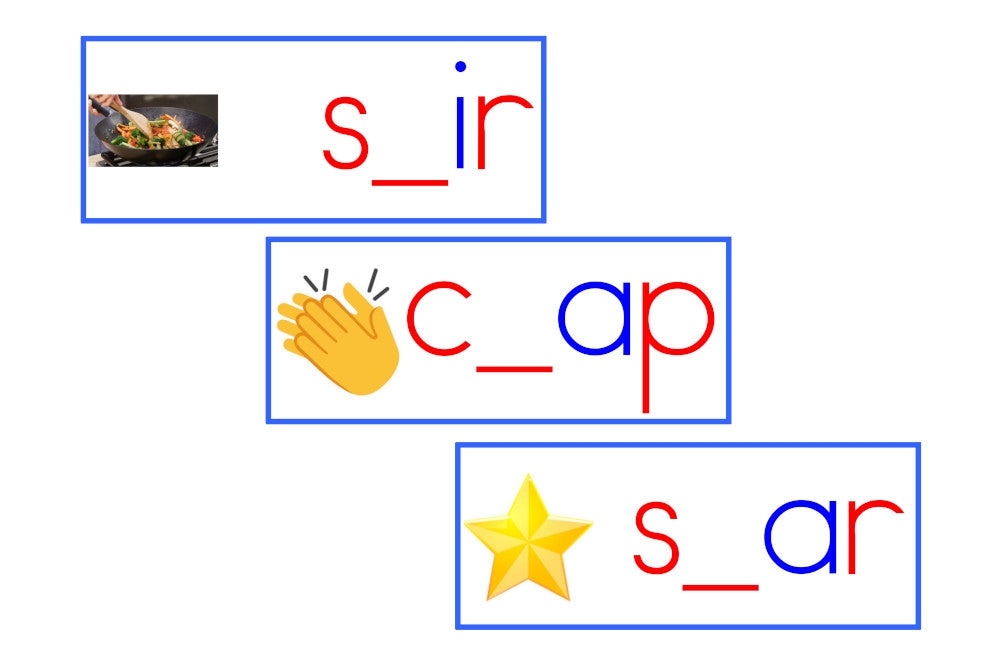 Children look at the picture of each card, determine the missing consonant, find the right alphabet in the Wooden Movable Alphabet set and fill in the blank.