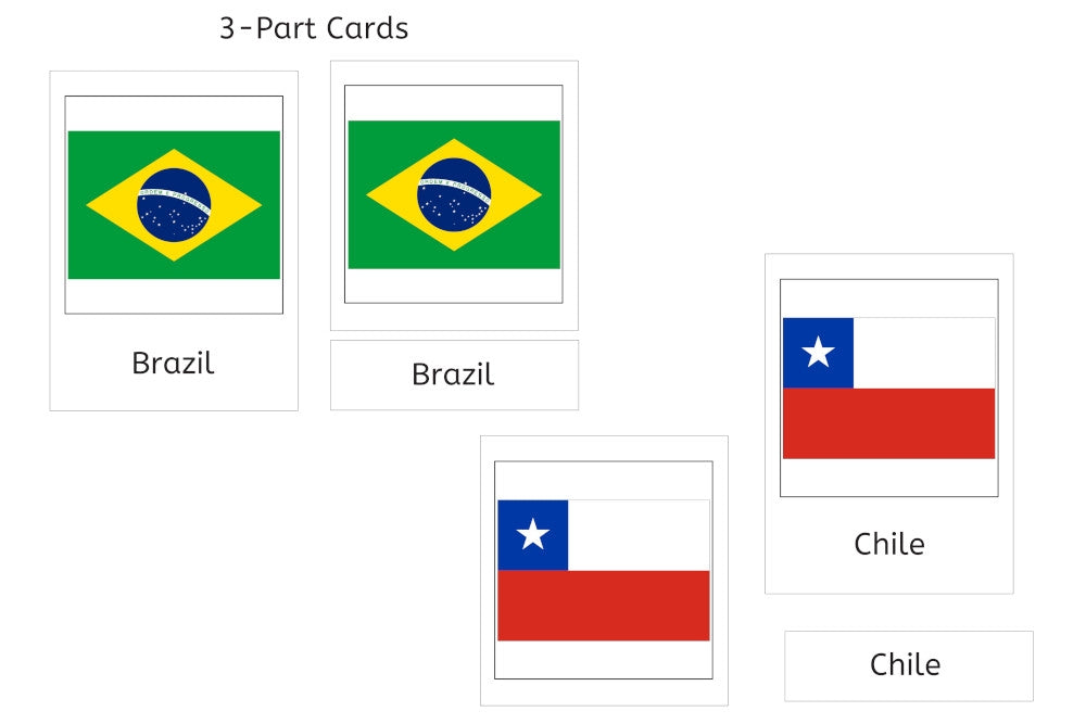 This downloadable PDF set includes 3-part cards for 13 flags of South America.