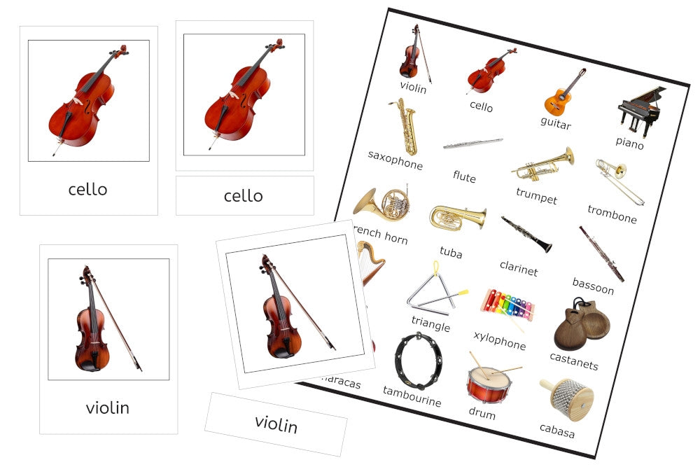 This downloadable PDF set includes 3-part cards for 20 types of musical instruments.