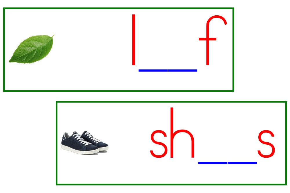 Children look at the picture of each card, determine the missing phonogram sound, find the right alphabet in the Wooden Movable Alphabet set and fill in the blank.