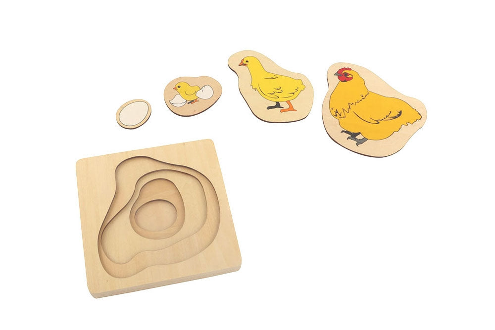 This puzzle helps children learn about a chicken's life cycle and also encourages hand-eye coordination and fine motor skills.