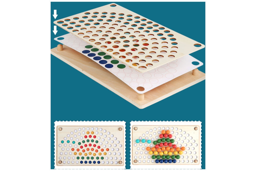 This set includes: one base board, one board with holes, 5 pattern cards, 7 silicone cups, 77 wooden colour balls, one wooden spoon, and a pair of wood chopsticks.