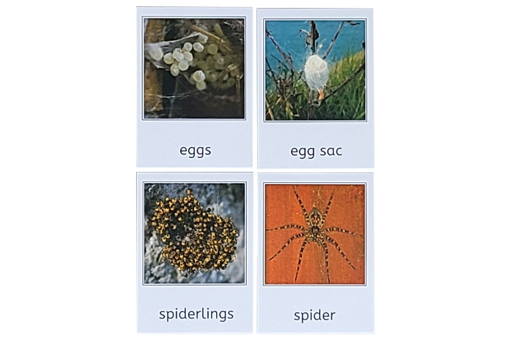 This set includes printed 3-part cards for 4 stages in the life cycle of a spider: egg, egg sac, spiderling, spider.