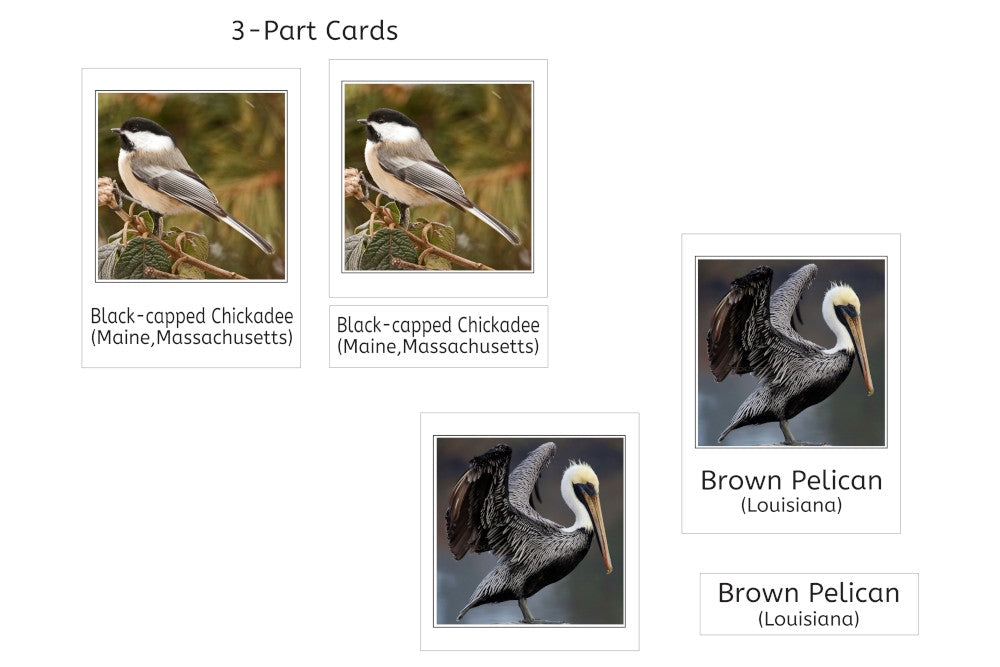 This downloadable PDF set includes 3-part cards for the State Birds of the USA.